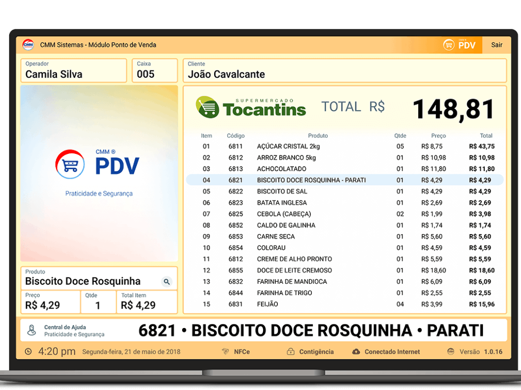 Possibilita a realização de suas vendas e impressão de cupom fiscal de forma mais rápida e com praticidade.Ideal para lojas que normalmente lidam com um grande fluxo diário de clientes. Facilmente você pode realizar vendas e escolher o método de pagamento que o cliente quer usar.